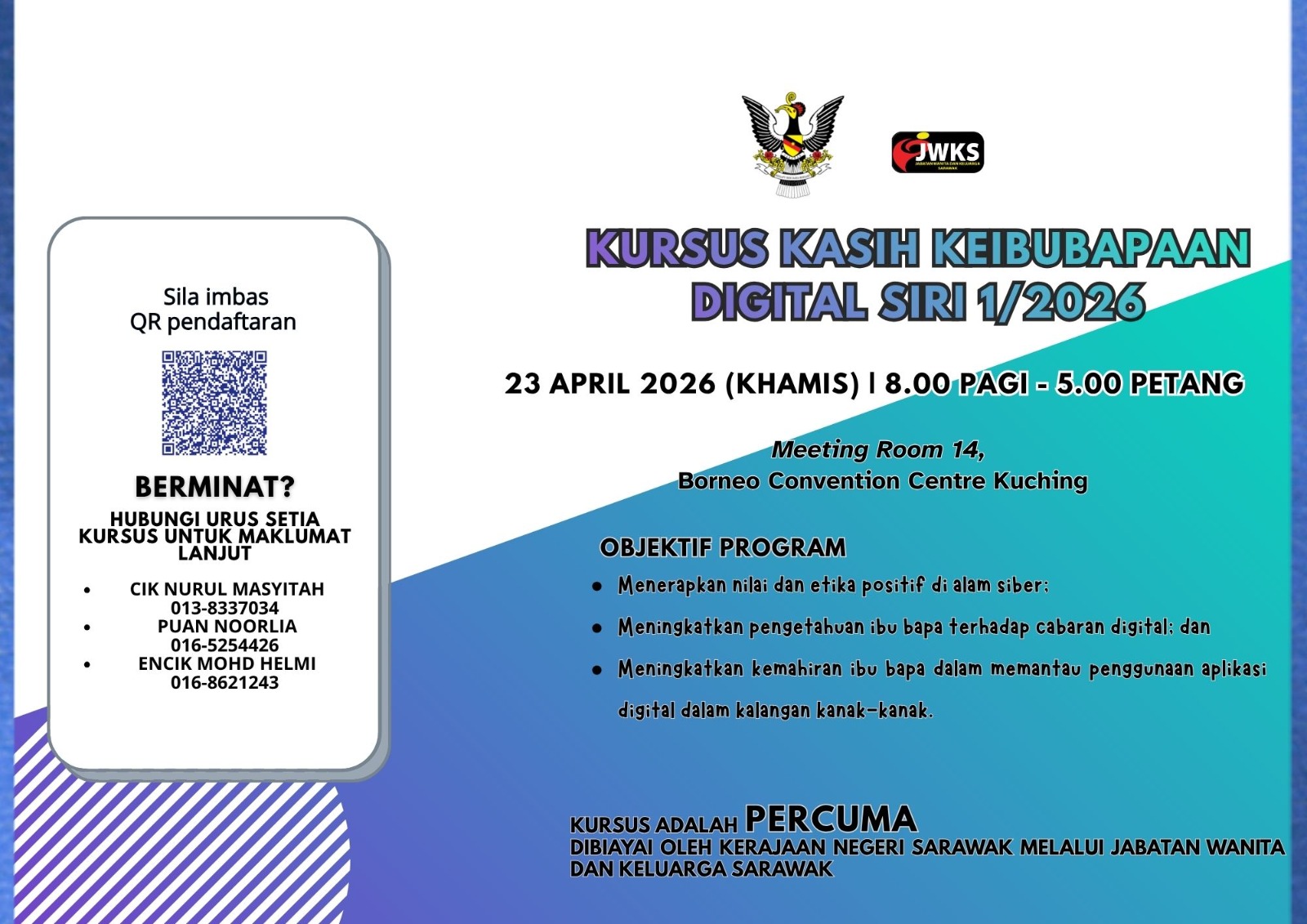 Jabatan Wanita Dan Keluarga Sarawak (JWKS) akan menganjurkan Kursus KASIH Keibubapaan Digital Siri 1/2026 seperti ketetapan berikut:-