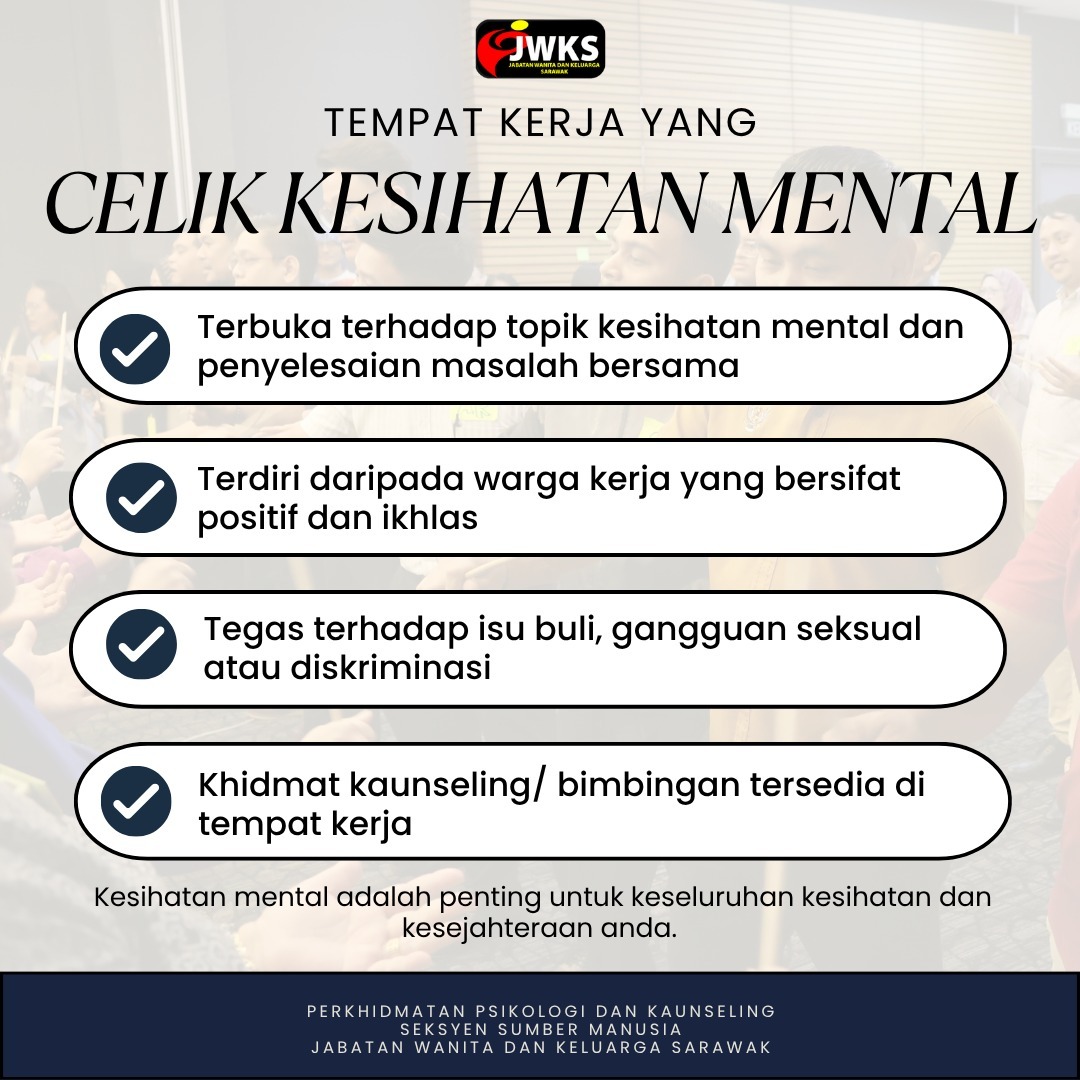 Warga kerja yang sedar dan celik akan kesihatan mental mampu bekerja dengan produktif dan harmoni. Oleh itu, kesihatan mental di tempat kerja adalah tanggungjawab semua.